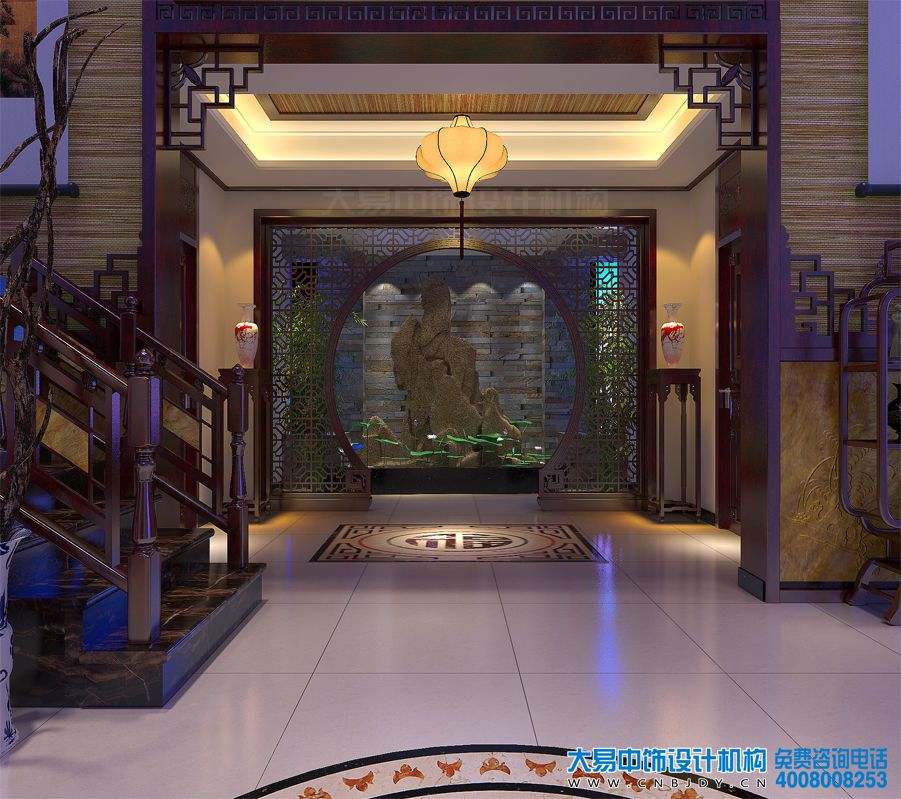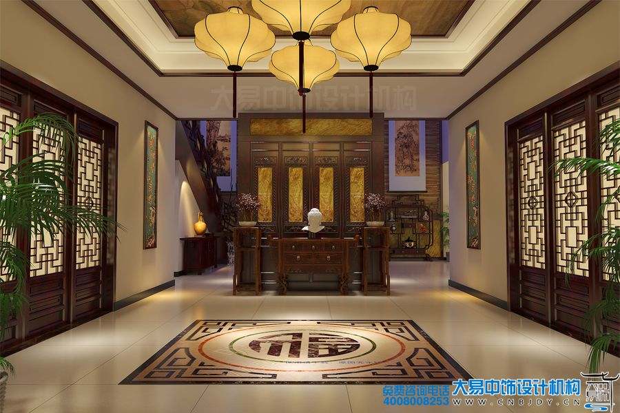 別墅門廳時尚美觀,中式古典畫的裝飾,表現(xiàn)出極致高雅的東方風(fēng)韻