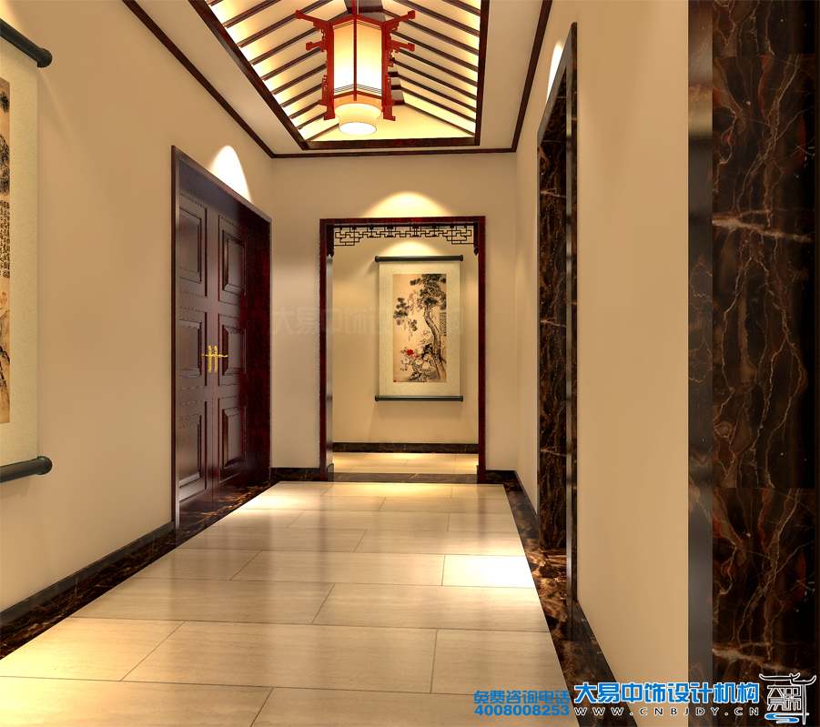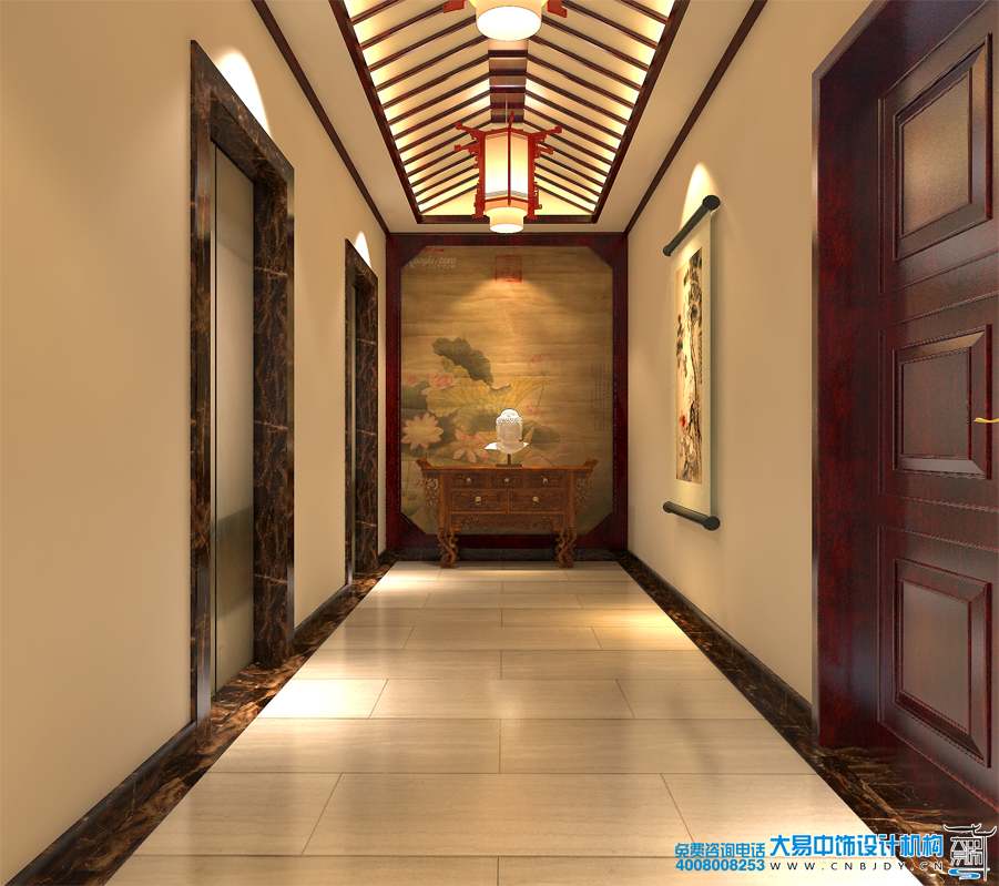 電梯間簡單方便,棕紅色的裝飾營造出中式風格的審美效果