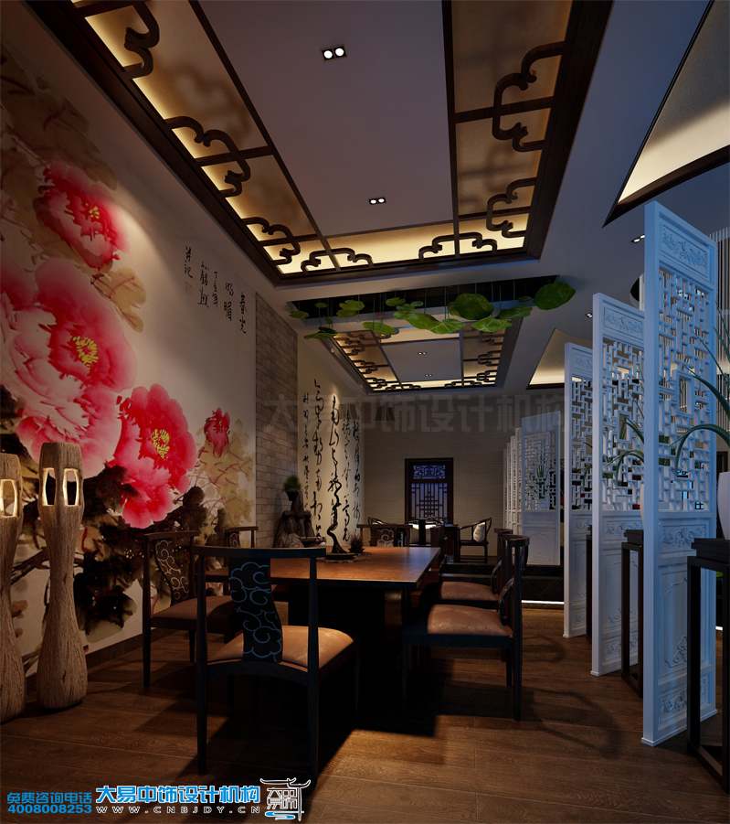 四人桌椅散座區用富貴牡丹掛畫點綴空白的乏味的餐廳墻壁,是很不錯的裝飾方式