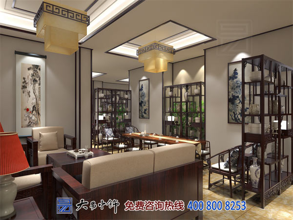 展廳中式裝修內(nèi)家具樣式繁復(fù),琳瑯滿目。其中博古架的款式也十分多樣,實(shí)用且具有很強(qiáng)的裝飾性。一個(gè)完美的中式家居之中,必不可少的便是造型傳統(tǒng)的博古架。