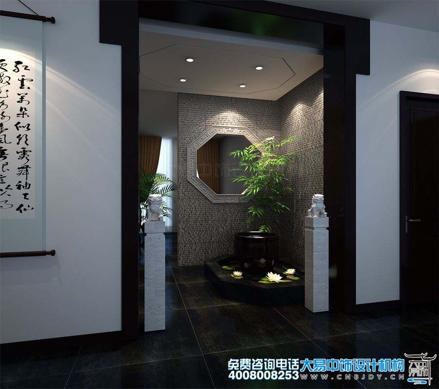 會所中式設(shè)計裝修的門廳,一體化設(shè)置的白色吊頂與影壁,讓空間設(shè)計簡約不少。月洞襯出幾株翠竹,郁郁蔥蔥,清幽靈動。來客休息處擺放中式桌椅,背景墻用水墨丹青為飾。臺下零落擺放盆栽綠植,園林石雕燈散發(fā)出淡淡光影。鳥籠燈高懸于頂,將一片明亮灑向四周。