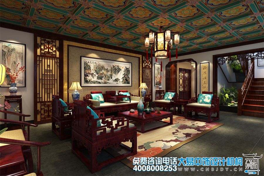 茶室的色調搭配豐富而不繁冗,明亮清新、雅致淡然。太師椅是四合院內庭坐具的不二選擇,最顯豪氣又不失莊重。在此,大易中飾設計師將高幾宮燈、青花瓷底座臺燈、吊頂木籠燈等中式元素巧妙結合,在便利現代人生活選擇的同時,最大限度將王府生活景象還原。平棋吊頂以大朵花團錦簇的圖案,花開富貴、花好月圓。