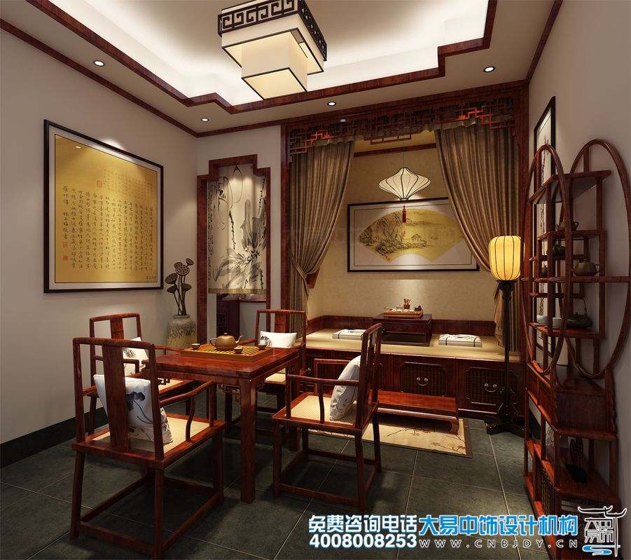 大易中飾在此四合院茶樓中式設計裝修時一改傳統的對稱陳設,八仙桌、中堂、辦公桌、立式書柜以對稱分列,墻面多以畫作增添才情雅韻。木屏將辦公桌與開會區簡單隔開,以木柱石墩頂天立地,,頗具藝術感的根雕吊燈散發出淡淡光影,一盆睡蓮靜靜綻放于此。“一花一世界,一葉一菩提”,蓮心禪韻漸漸暈染開來,彌漫四周。