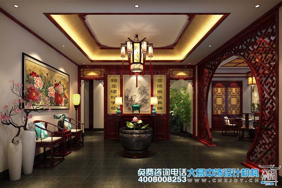四合院會所中式設計,在門廳處設計中堂為屏,條案上的葫蘆型座燈既可作為裝飾,又將畫幅的內容映照出來,一舉兩得。竹節臺燈佇立一旁,墻上懸掛著富貴芙蓉圖,有著富貴吉祥的美好寓意。庭中擺一水甕,一株睡蓮靜靜綻放,為整個空間增添些許禪意和自然氣息。朱紅色的餐廳桌椅,搭配上精致的中式六角宮燈,使整個餐飲空間硬朗而又華麗、優雅。