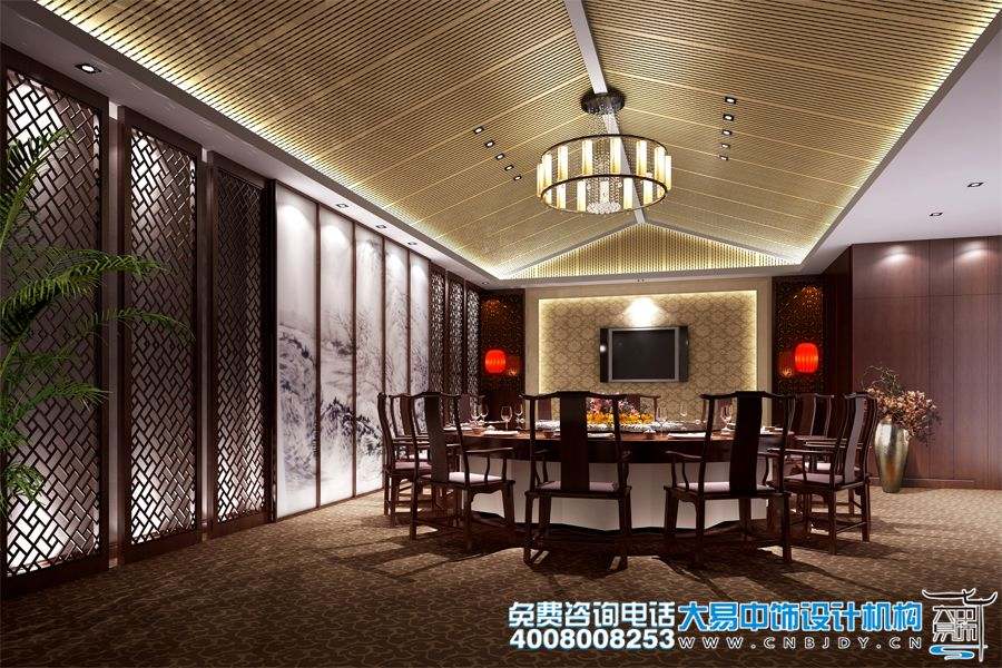 雅間中式設(shè)計(jì)裝修,依然使用屋檐式人字吊頂,但線條較為簡(jiǎn)約,造型簡(jiǎn)單。圓形宮燈像十?dāng)?shù)支蠟燭的合成,在中式風(fēng)格的基礎(chǔ)上又略顯現(xiàn)代藝術(shù)氣息。墻面用木欄將水墨丹青框飾起來(lái),又以鏤空木屏為隔斷,在簡(jiǎn)約之處體現(xiàn)著空靈的美感,給空間增添幾分禪意。