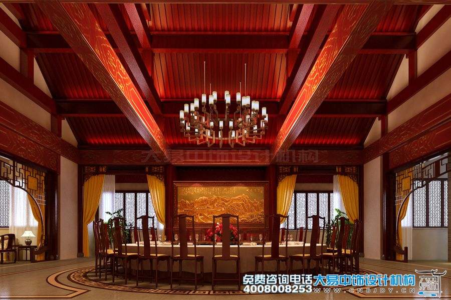 大易中飾在此餐飲會所中式設計裝修中引用中國傳統主色調紅黃二色,襯托出一派宮廷王室的御宴景象,在現代社會能顯出如此氣派,非中式設計所不能有!