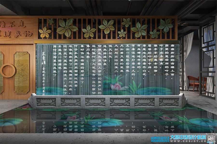 清華園內(nèi),水木清華是一個(gè)不可多得的好去處。高山流水,荷葉田田,景色宜人,別樣生動(dòng)。朱自清那篇被選入教科書(shū)的《荷塘月色》更是讓不少人對(duì)此神往不已。清華園主題餐廳中式設(shè)計(jì)裝修,將荷塘引入大堂之內(nèi),并將散文《荷塘月色》鐫刻于影壁之上,令人賞心悅目。又因紫荊花為清華大學(xué)校花,“自強(qiáng)不息 厚德載物”為清華大學(xué)校訓(xùn),花瓣與句式均被特別凸顯,餐廳的主題在大堂之處一覽無(wú)余。
