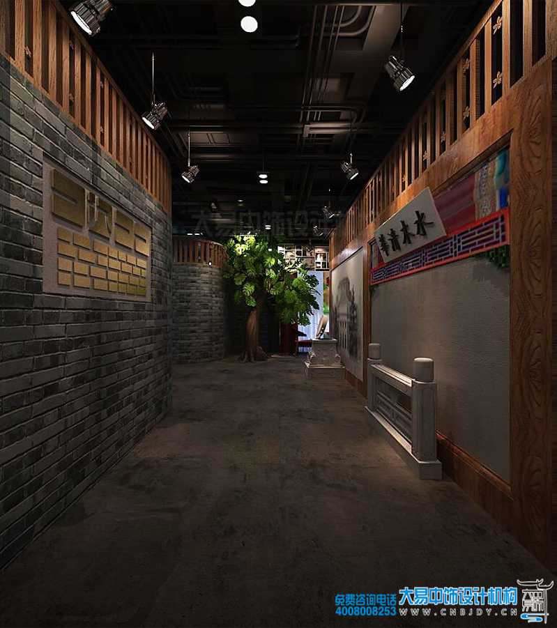 大堂影壁之后是通往就餐區(qū)的過(guò)道。背面正懸掛著“水木清華”的匾額,與影壁正面的裝飾相襯。過(guò)道墻壁均以灰色磚墻和木欄搭配,在傳統(tǒng)風(fēng)情之上又加金屬性標(biāo)識(shí),頗具現(xiàn)代感。另在墻角處景觀樹(shù)為整個(gè)偏冷色調(diào)的環(huán)境增添不少自然氣息,清華園的老照片又彰顯著其厚重的歷史底蘊(yùn)。