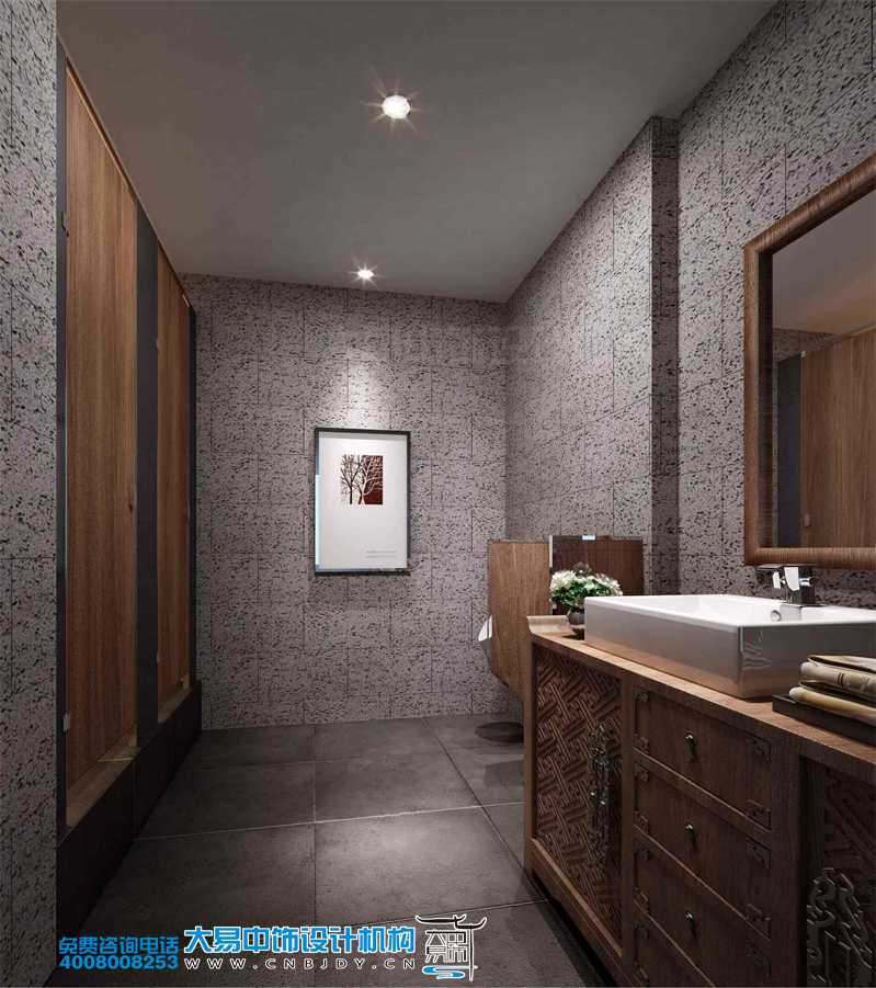 餐廳衛(wèi)生間以中式設(shè)計(jì)為主,色調(diào)與整體保持一致,用灰色和原木色搭配。洗臉池水臺(tái)以木柜為底座,考究典雅,設(shè)計(jì)精美。墻面懸掛校友作品,處處體現(xiàn)清華校園的人文氣息。