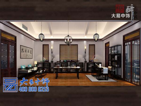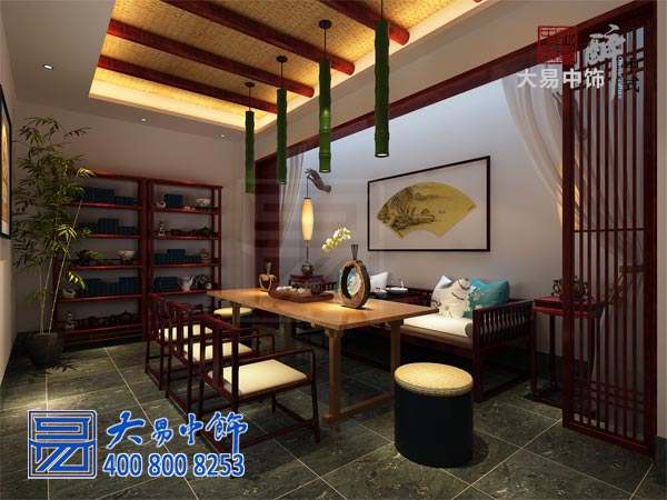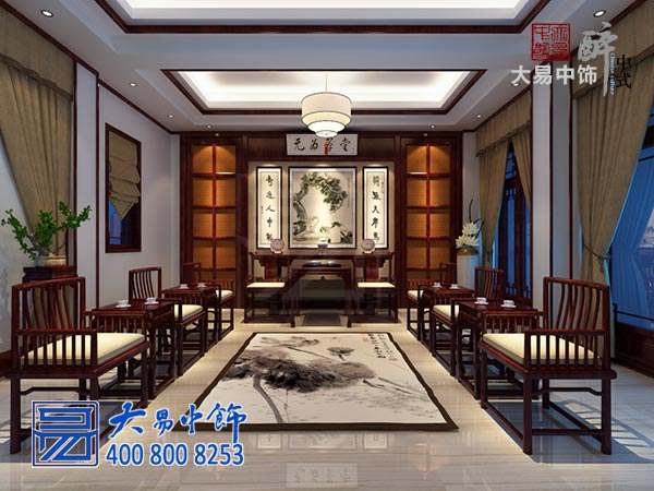 禪修別墅中堂中式設計裝修,簡約木欄吊頂讓頂部空間在方圓之中渾然一體,正堂背景以掛畫、木屏為飾,以條案置放香鼎、坐屏,映入眼簾的是濃濃的傳統中式氣息。左右兩列圈椅依次排開,紅木家具與白瓷地板以及淺黃色地毯搭配相襯,以顯和諧靜雅之風。落地窗搭配素色帷幔,與百葉狀的竹簾相宜,古樸自然。