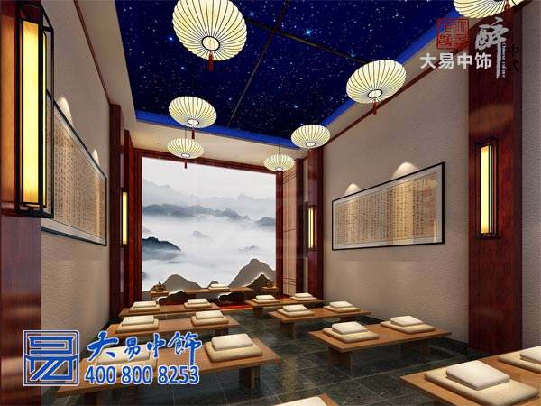 負一層禪堂是此禪修別墅的主場地。因是禪修所需,一切以修心為上,在外部裝飾終力求簡潔、明朗、淡雅的色調。墻面有壁燈為飾,懸以巨幅佛經書法作品。整體墻面以底色白色為主。正堂為巨幅山巒水墨丹青,遼闊高遠,溢于畫外。