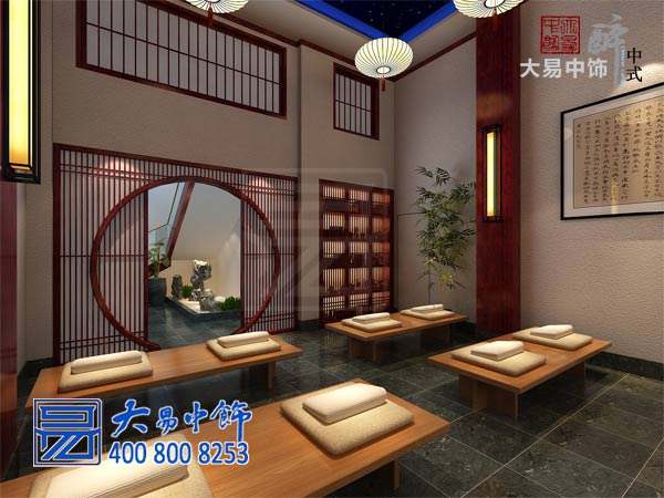 禪修別墅禪堂中式設計裝修,與我國古時書院課堂頗為相似,而從設計風格來看,又頗具和室風情。入門為推拉式月洞木欄門,門窗皆以簡約木欄為主要風格。墻壁內嵌入木柜,置放禪修人員私人物品。