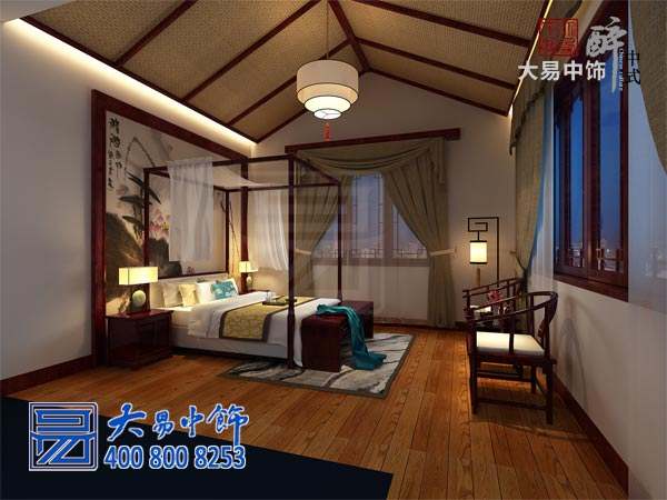 禪修別墅中式設計裝修,臥室采用人字形吊頂,宮燈高懸,映照出室內的樸素質感。