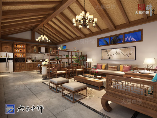 客廳采用中式傳統露明頂設計,顯得空間高達寬敞,并具有傳統中式韻味. 舒適溫馨的公共空間,可以坐著聊聊天喝喝茶.