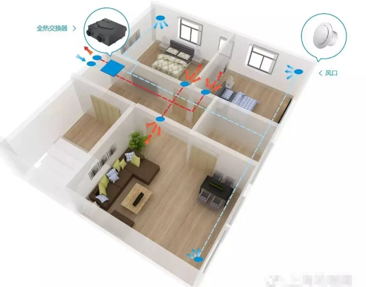 正確的打開方式:室內(nèi)外的進(jìn)風(fēng)口和出風(fēng)口都要盡量的遠(yuǎn),最好的距離一般在1米以上,最短間距也要有三倍管徑長度,來避免剛剛進(jìn)入室內(nèi)的新鮮空氣就被馬上排出。
