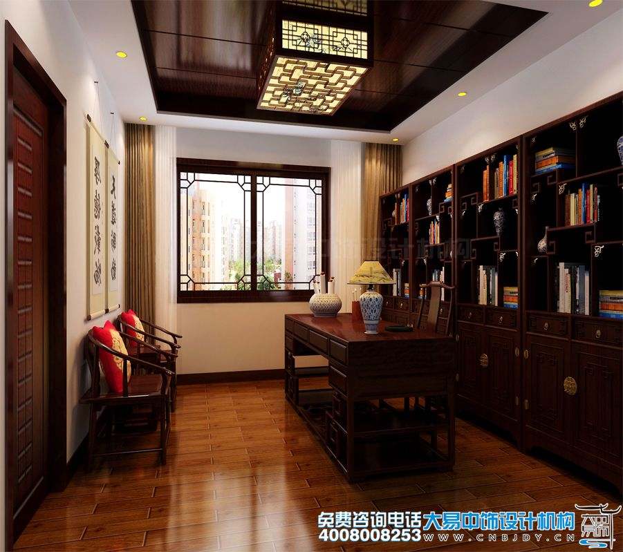 儒雅深沉的書房空間設計,也不乏一絲現代簡潔風。“天道酬勤 厚德載物”,書房是業主極為個性和隱私所在。設計簡約明了,裝飾簡單大方,很適合在此暢游書海,攀登一座又一座知識的高峰。