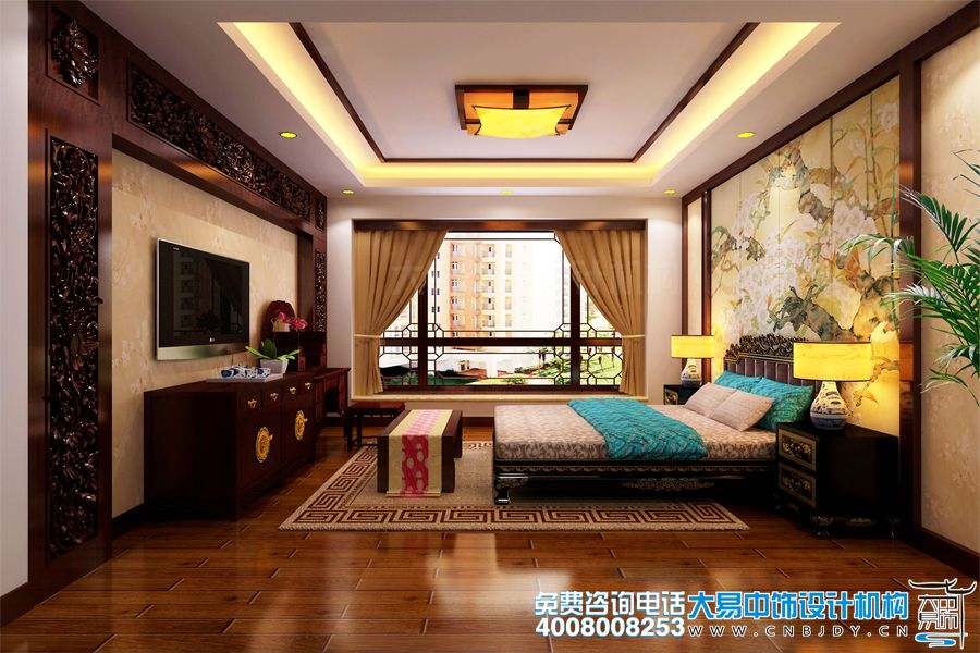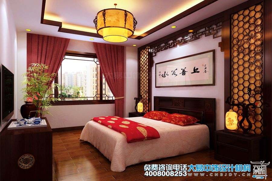 臥室新中式設計,氛圍柔美靚麗,給家人創造出舒適、優雅的休息環境。臥室的顏色比其他居室內的要更為豐富一些,更具有生活氣息和情趣?;B圖的背景墻表達富貴吉祥、家庭和睦的美好寓意,雕花木床承載著能工巧匠的手藝,也承載著主人一夜又一夜的好夢。