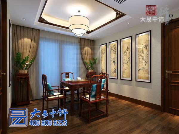 書房的設計頗具文人的清雅高潔之氣。雕花書桌,文房四寶俱全,背景墻以竹韻詩畫裝裱作品。墻角幾株翠竹,吊燈用鏤空字紋木框,四角飛揚的流蘇,在上空散發出書香氣息。