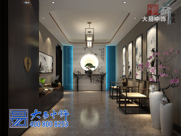 玄關之處宛若廣寒宮大殿,有著如月華般的清雅,亦有蘭桂馥郁的芬芳。白瓷插瓶桃紅正濃,梅蘭松菊掛畫為灰底色的墻面點綴,一派詩情畫意。