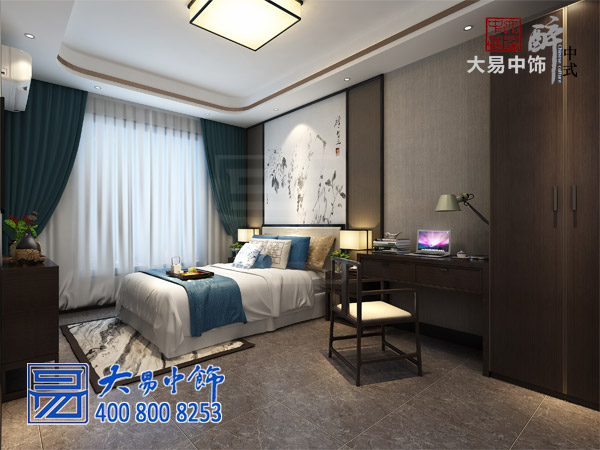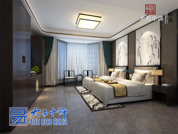 客棧最重要的空間為臥室,本案例中空乘專用臥室新中式設計采用冷暖色搭配,床品設計與中式刺繡、錦緞相配合,在白底的襯托下更顯素雅。簡潔的燈具與床具,是除去繁瑣之后的安逸和舒適。全木衣柜、白紗帳圍飾的落地窗,凸顯臥室空間硬軟裝的選材精美大氣。