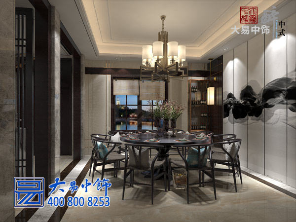 餐廳中式設計,墻壁選擇拼裝組合的潑墨留白背景,落地窗用竹簾裝點,吊頂以仿燭臺的宮燈高懸,與圓形餐桌相互映襯。灰色與白色的大量運用在給人舒適的視覺感官之外,讓就餐者收獲更多精神上的愉悅和放松。